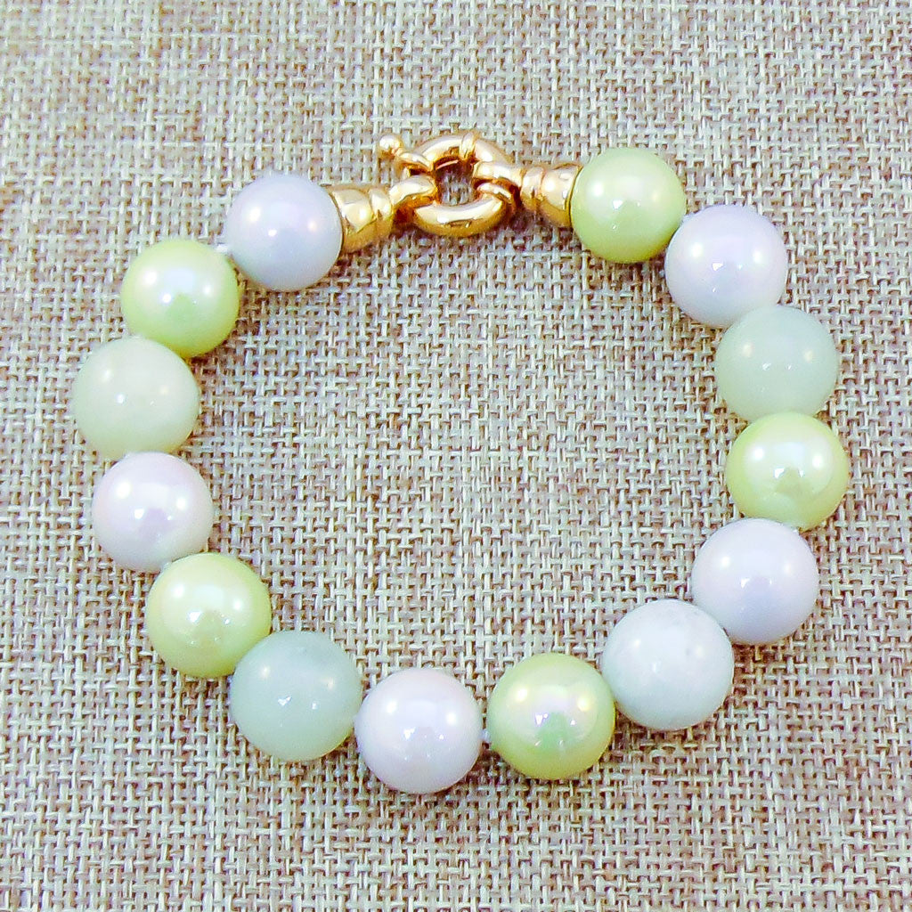 Mallorca pearls. Lime green and light blue pearls with crystals and gold plated springring clasp.